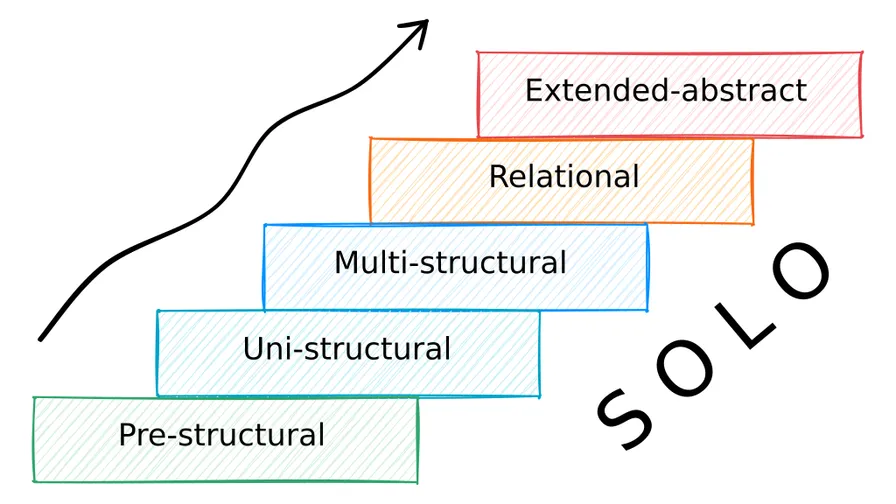 We can think of the brain’s natural flow of learning as occurring in stages. This is where the Structure of Observed Learning Outcomes (SOLO) comes in. Developed by John Biggs and Kevin Collis in 1982, SOLO describes levels of increasing complexity in a student’s understanding, moving from surface knowledge to deep understanding.